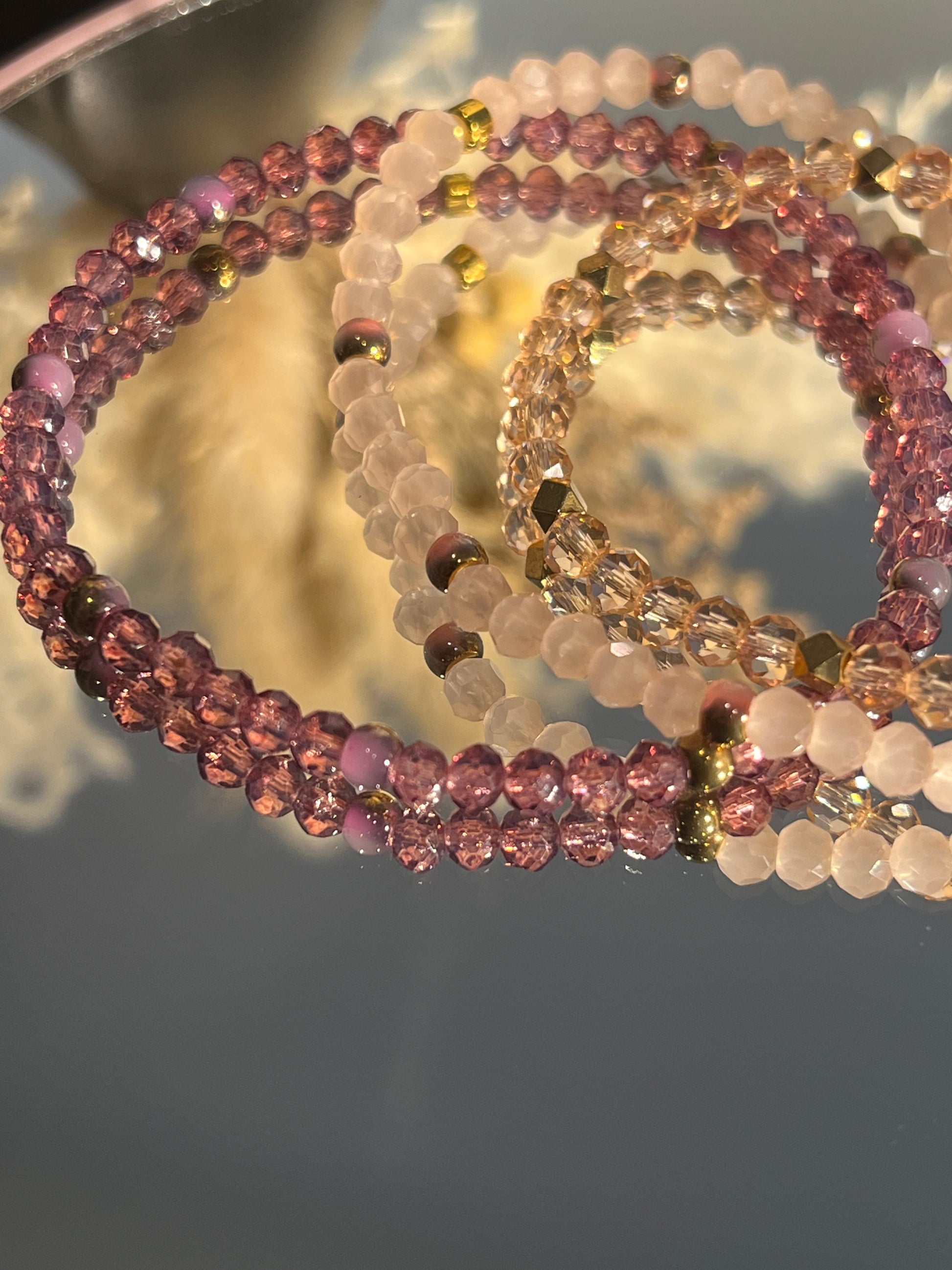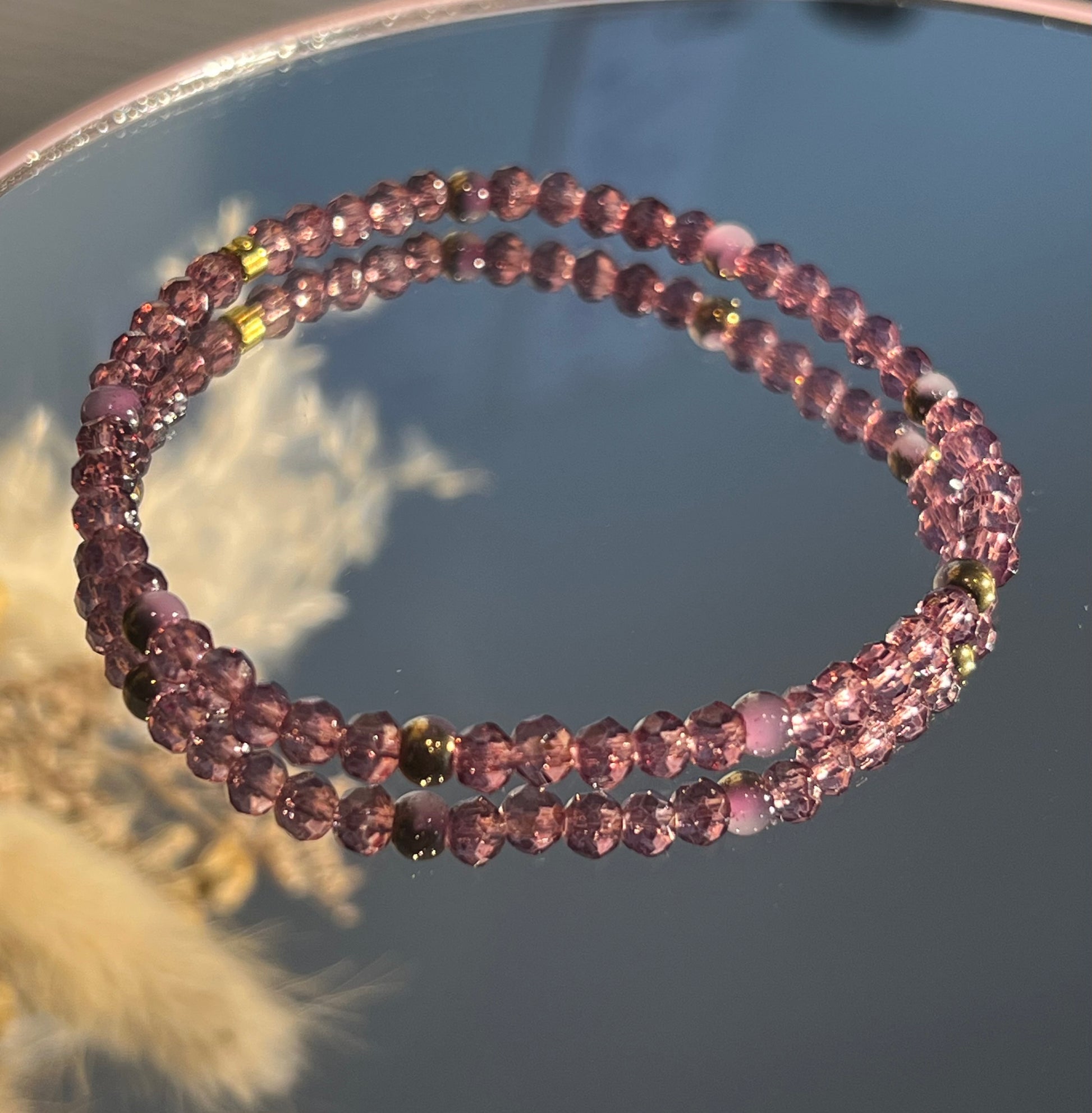 Et sofistikert armbånd med dype lilla krystaller og elegante gulldetaljer. Dette håndlagede smykket kombinerer rike fiolett toner med gylne accenter for en luksuriøs og tidløs look.