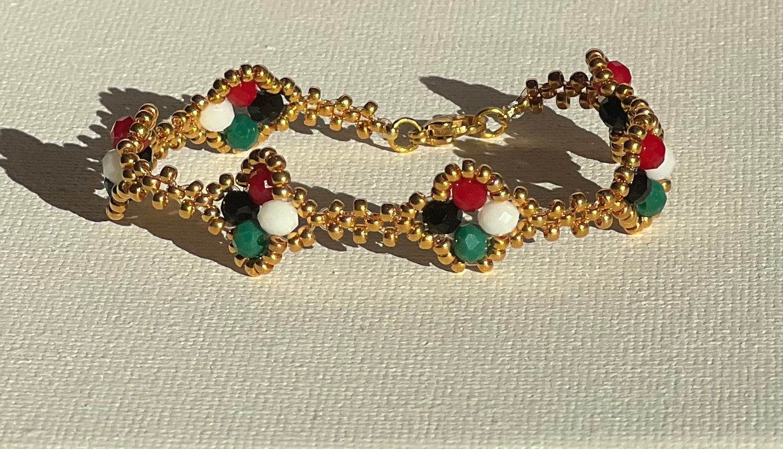 Et vakkert håndlaget armbånd som ærer det palestinske flagget med sine symbolske farger. Dette elegante smykket er laget med høykvalitets gullbelagte perler i rød, hvit, grønn og svart - fargene som representerer palestinsk identitet og stolthet.